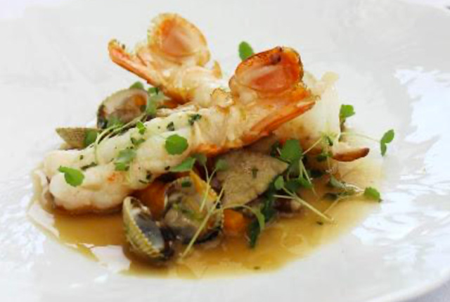 Pêche du jour : filets de rougets & daurades vinaigrette aux agrumes *** Volaille farcie aux champignons et Foie gras, pomme galet, ail confit, oignons frits & Velouté de topinambours *** Dessert à l’assiette : Tartelette citron meringuée et sorbet minute citron-gingembre