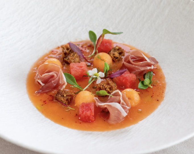 Gaspacho de melon et pastèque, prosciutto et croûtons de pain d’épice *** Rumsteak d’agneau rôti au jus de thym, cromesquis à l’ail, carottes nouvelles et panosse *** Clafoutis aux pommes et Calvados, crème anglaise à la vanille et caramel au beurre salé