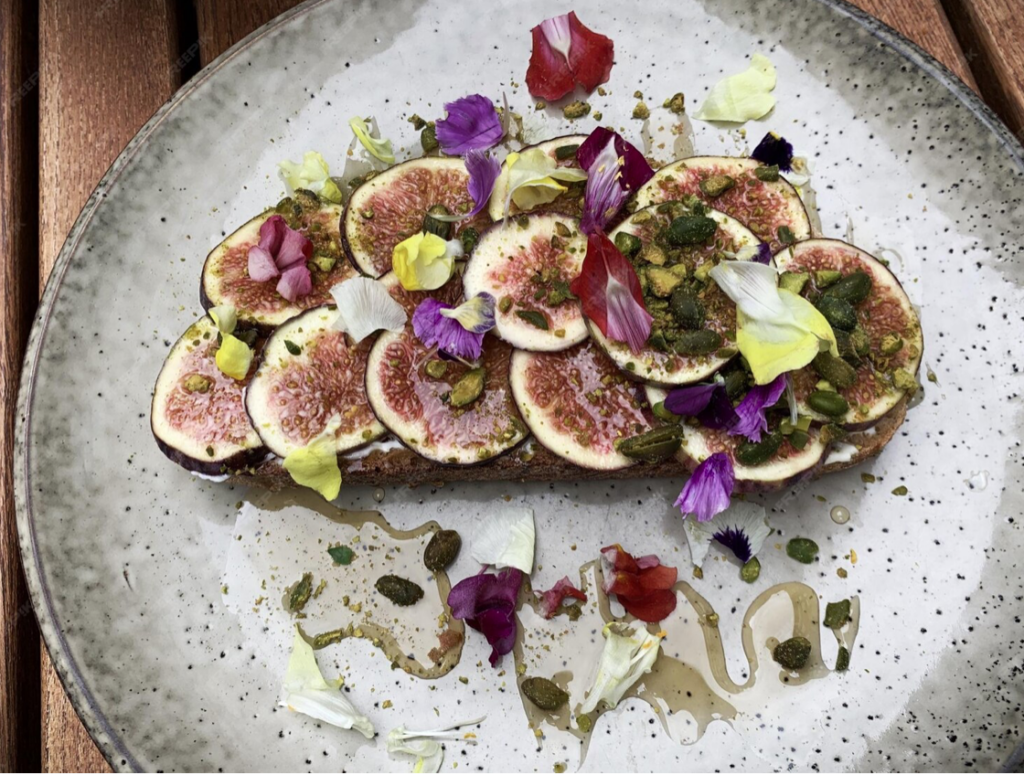 - Fromage de chèvre chaud sur pain aux figues, nappé d’un filet de miel de lavande.