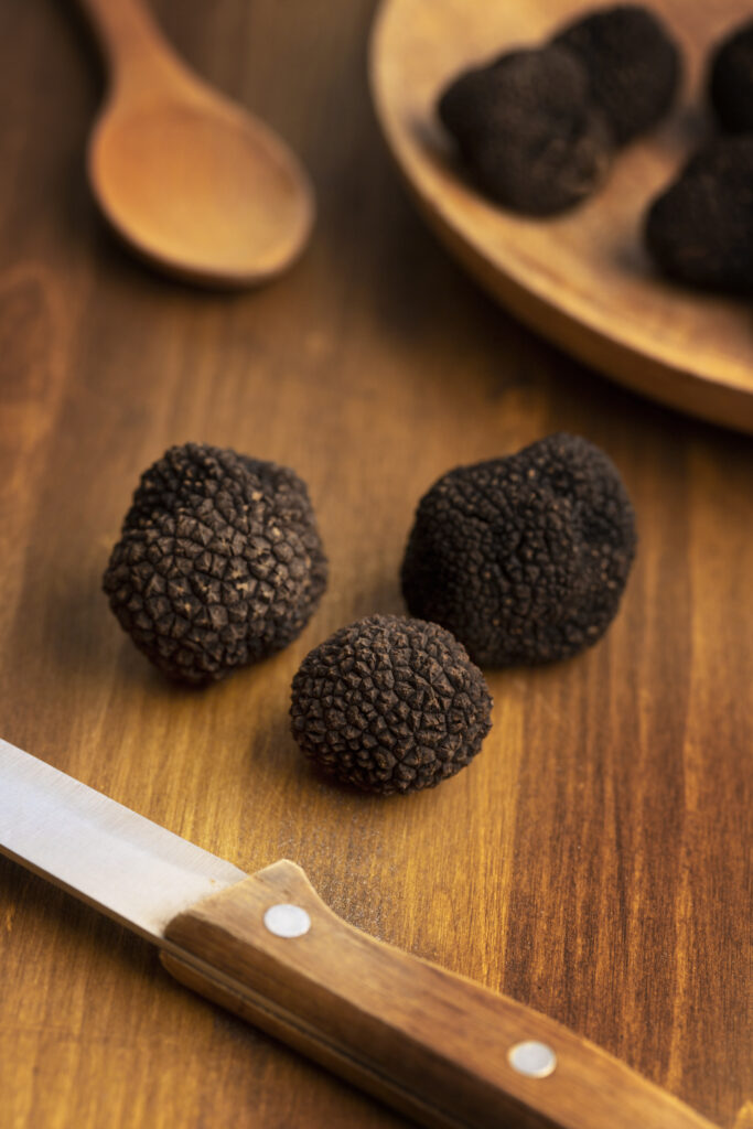 Truffe de référence en gastronomie, elle pousse l’hiver et ses arômes sont puissants : sous-bois, noisette, cacao…