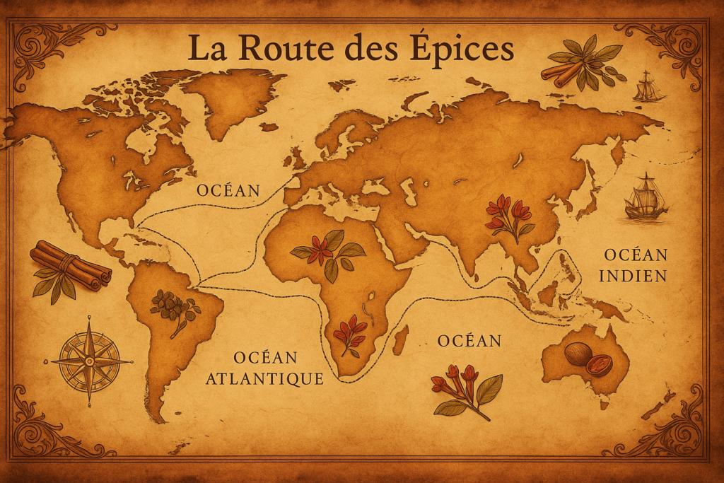 D’abord trésors plus précieux que l’or, elles voyageaient des confins de l’Inde, de Ceylan ou des Moluques jusqu’aux ports de Venise et d’Alexandrie, empruntant les fameuses routes des épices. Poivre, cannelle, clou de girofle et muscade étaient alors des symboles de pouvoir, de raffinement et de mystère.